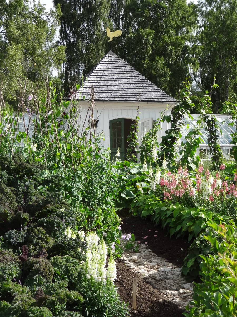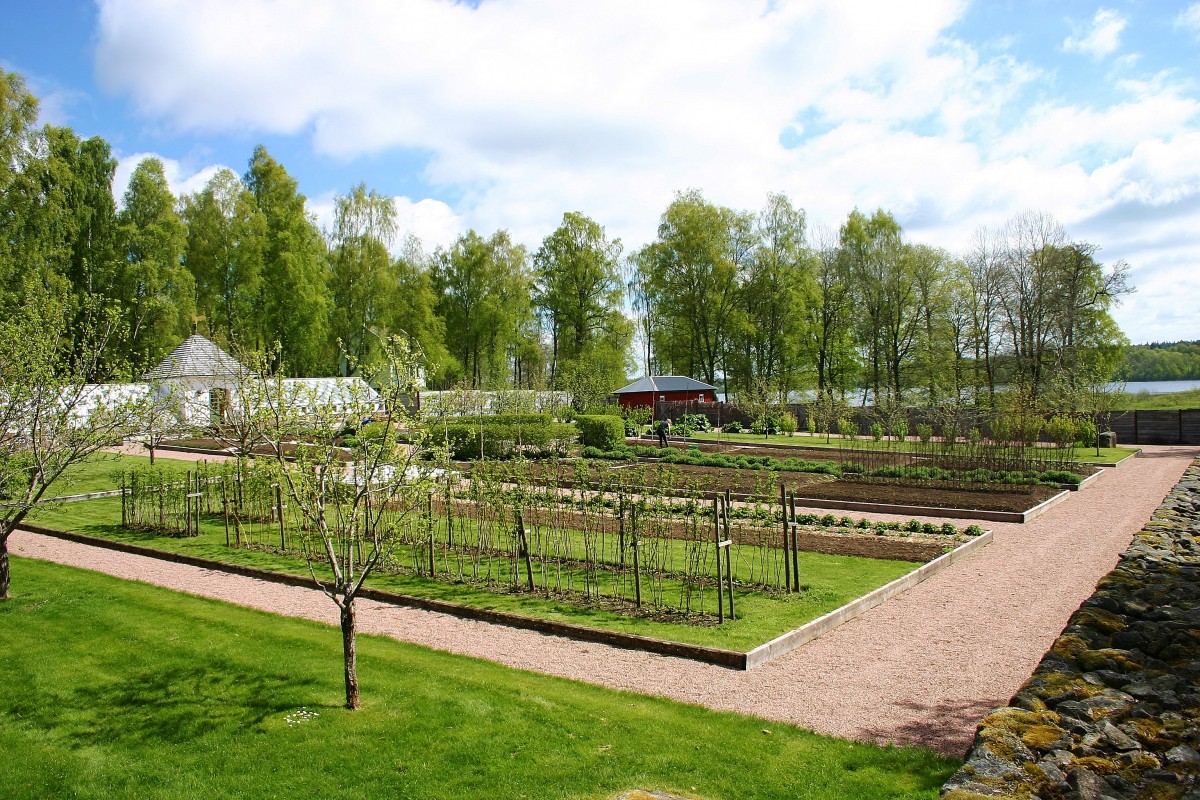 Den idag så fantastiska köksträdgården fanns intet av år 2000, men man kunde ana spåren efter den. Växthuset och lusthuset som byggdes på 1930-talet fanns förvisso men själva köksträdgården var då betesmark för får! Köksträdgården byggdes upp igen efter traditionellt mönster, den gamla matjorden fanns kvar, och odlas i dag helt hantverksmässigt, det vill säga att allt drivs från frö i växthus sedan via drivbänkar ut på friland, givetvis ekologiskt. Stilen på köksträdgården är lite fransk vilket innebär en dekorativ nyttoträdgård, man blandar grönsaker, blommor och andra vackra växter till en estetisk helhet. Trädgården innehåller allt man kan önska i form av frukt, bär, grönsaker av alla slag och som sagt blommor.